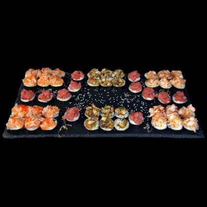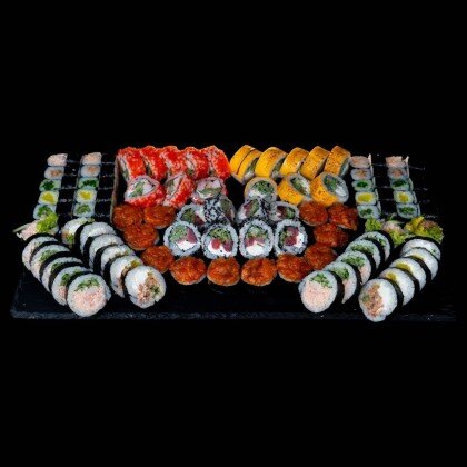 Tataki Sake Grill 8 szt Tataki Sake 8 szt Philadelphia 8 szt Shrimp roll 8 szt Sushi Burger Pieczony Łosoś Sushi Burger Łosoś Zestaw zawiera: Sos Sojowy 3 szt Imbir 1 szt Wasabi 1 szt Pałeczki 3 szt Rękawiczki 2 komplety