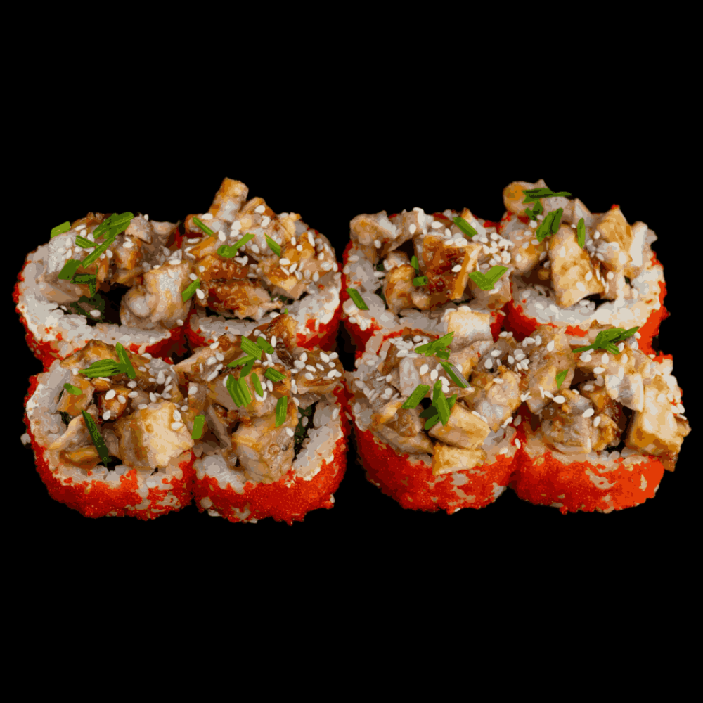 Ryż, Nori, Serek Philadelphia, Ogórek, Awokado, Kampio, Masago, Węgorz unagi. Posypane sezamem i szczypiorkiem