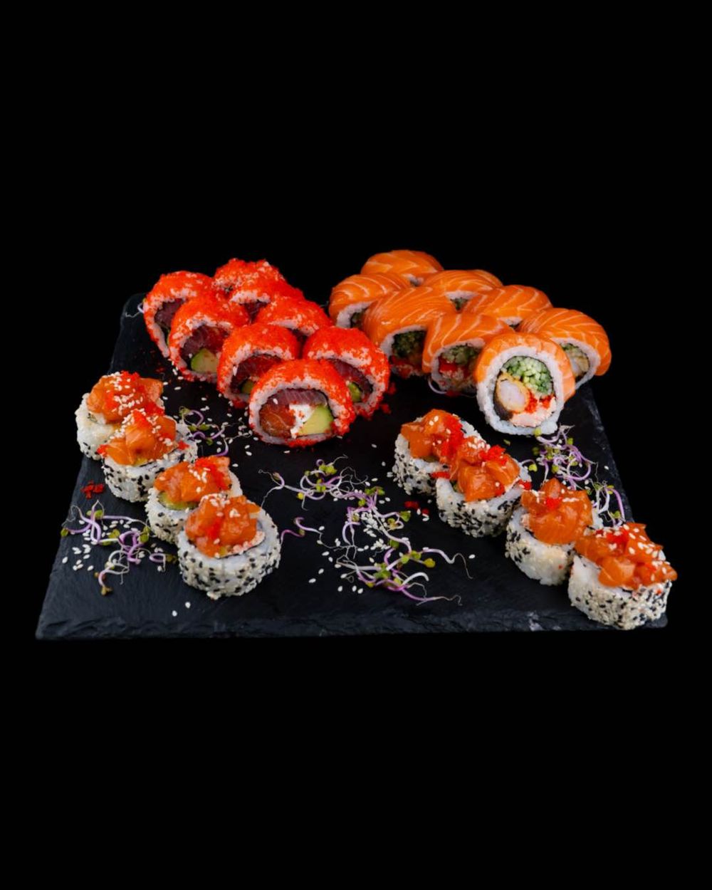 California Łosoś i Tuńczyk Deluxe 8 szt Uromaki z Krewetką w Tempurze i Łososiem Deluxe 8 szt Futomaki Tatar z Łososia 8 szt Zestaw zawiera: Sos Sojowy 2 szt Imbir 2 szt Wasabi 2 szt Pałeczki 2 szt