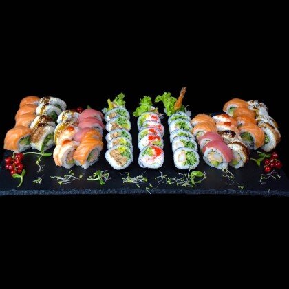 Roll Tatar z Łososiem 12 szt Roll Tatar z Krewetką 12 szt Roll Tatar z Tuńczykiem 12 szt Roll Tatar z Węgorzem 12 szt Zestaw Zawiera: Sos Sojowy 4 szt Imbir 2 szt Wasabi 2 szt Pałeczki 4 szt