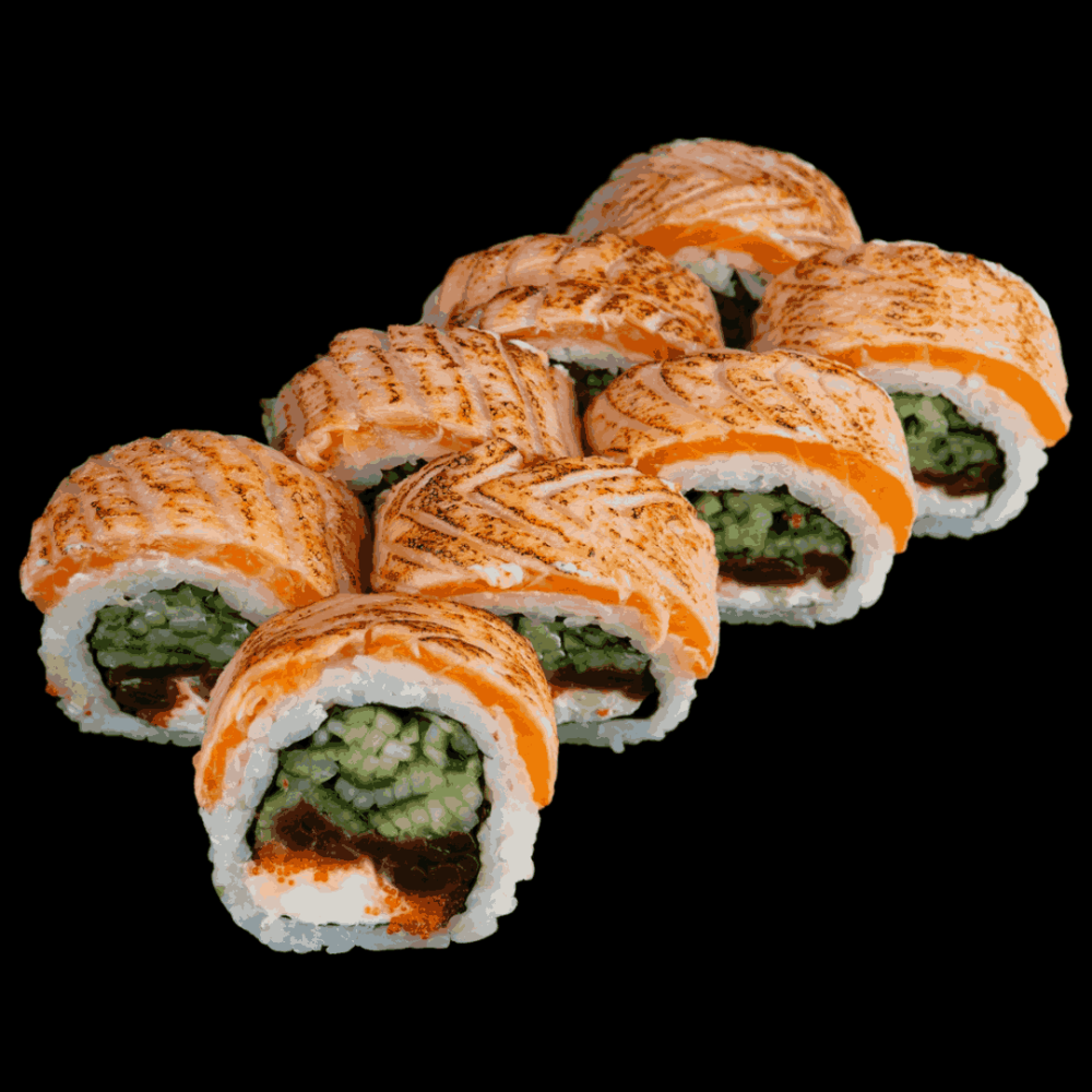 Ryż, Nori, Serek Philadelphia, Kampio, Masago, Ogórek, Opalony łosoś. Polewane Unagi i Posypane Sezamem